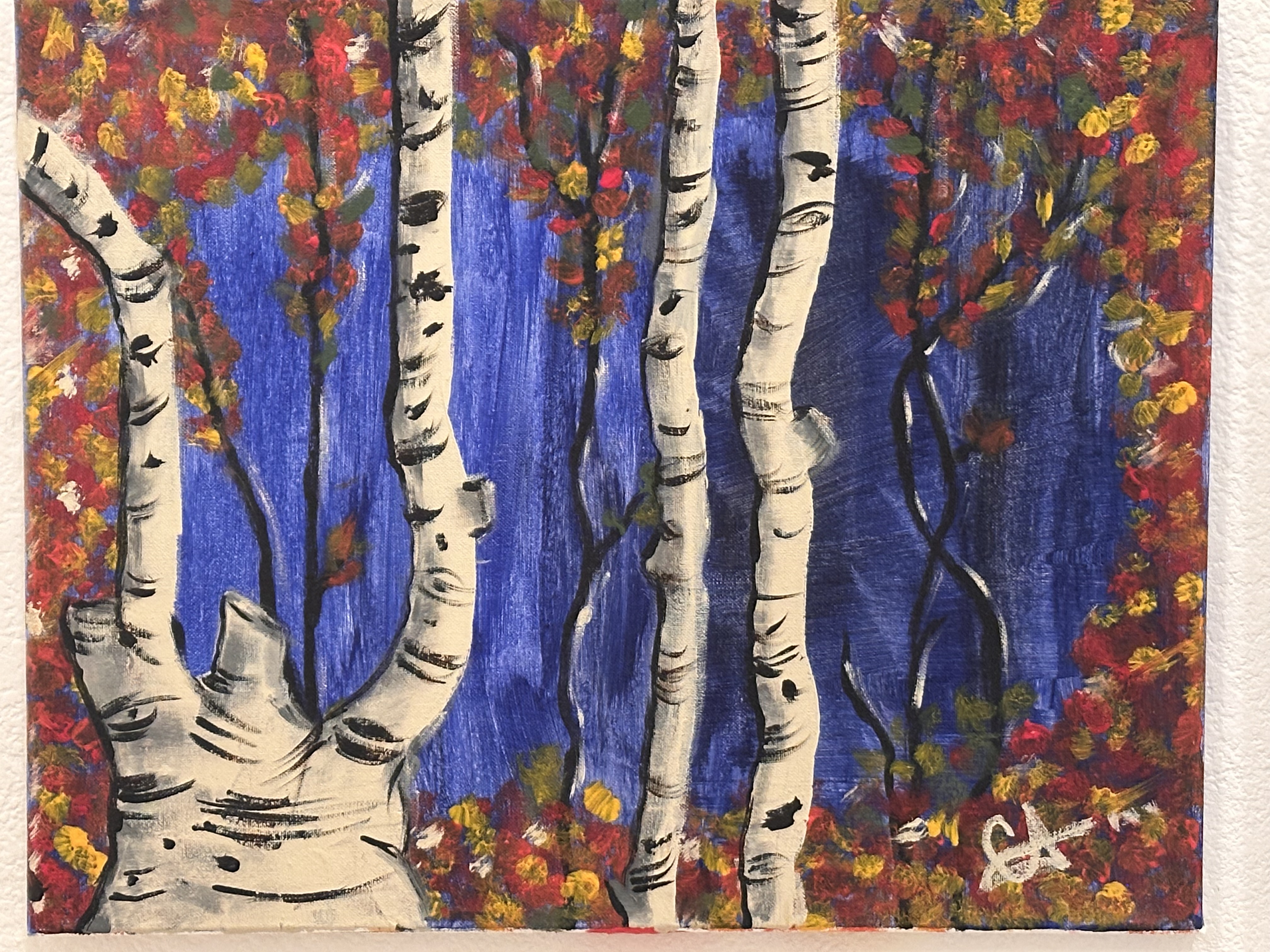 This acrylic painting captures the quiet beauty of a birch grove in full autumn color. Slender white trunks, marked with dark, expressive lines, rise vertically across the canvas, their smooth bark contrasting against a richly textured background of deep, luminous blue. Surrounding the trees, bursts of warm reds, oranges, and golden yellows suggest leaves in peak fall brilliance, applied with a lively, almost impressionistic touch.